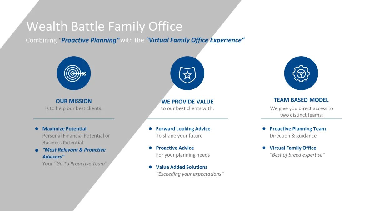 If you could benefit from one collaborative team of advisors working to maximize your wealth, but you don’t quite have the net worth of the Rockefellers, schedule a call to see how the Wealth Battle Family Office can help.